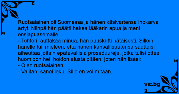 Ruotsalainen oli Suomessa ja hänen käsivartensa ihokarva ärtyi. Niinpä hän päätti hakea lääkärin apua ja meni ensiapuasemalle.