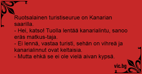 - Ei lennä, vastaa turisti, sehän on vihreä ja kanarialinnut ovat keltaisia.