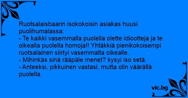 - Te kaikki vasemmalla puolella olette idiootteja ja te oikealla puolella homoja!! Yhtäkkiä pienikokoisempi ruotsalainen siirtyi vasemmalta oikealle.
