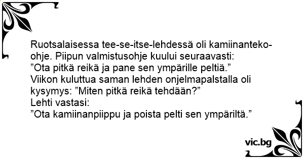 Ruotsalaisessa tee-se-itse-lehdessä oli kamiinanteko-ohje. Piipun valmistusohje kuului seuraavasti: