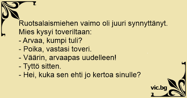 Ruotsalaismiehen vaimo oli juuri synnyttänyt. Mies kysyi toveriltaan: