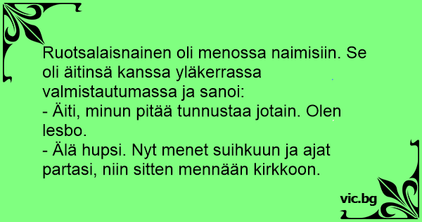 Ruotsalaisnainen oli menossa naimisiin. Se oli äitinsä kanssa yläkerrassa valmistautumassa ja sanoi: