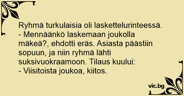 Ryhmä turkulaisia oli laskettelurinteessä. - Mennäänkö laskemaan joukolla mäkeä?, ehdotti eräs. Asiasta päästiin sopuun, ja niin ryhmä lähti suksivuokraamoon. Tilaus kuului: