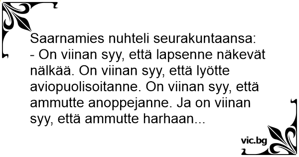 - On viinan syy, että lapsenne näkevät nälkää. On viinan syy, että lyötte aviopuolisoitanne. On viinan syy, että ammutte anoppejanne. Ja on viinan syy, että ammutte harhaan...
