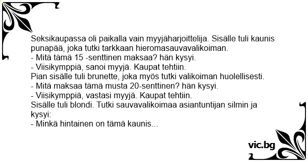 Seksikaupassa oli paikalla vain myyjäharjoittelija. Sisälle tuli kaunis punapää, joka tutki tarkkaan hieromasauvavalikoiman.