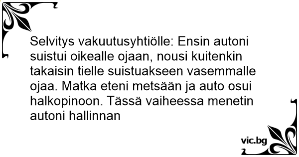 Selvitys vakuutusyhtiölle: Ensin autoni suistui oikealle ojaan, nousi kuitenkin takaisin tielle suistuakseen vasemmalle ojaa. Matka eteni metsään ja auto osui halkopinoon. Tässä vaiheessa menetin autoni hallinnan