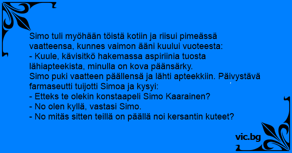 Simo puki vaatteen päällensä ja lähti apteekkiin. Päivystävä farmaseutti tuijotti Simoa ja kysyi: