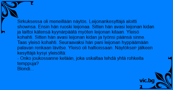 Sirkuksessa oli meneillään näytös. Leijonankesyttäjä aloitti shownsa. Ensin hän ruoski leijonaa. Sitten hän avasi leijonan kidan ja laittoi kätensä kyynärpäätä myöten leijonan kitaan. Yleisö kohahti. Sitten hän avasi leijonan kidan ja työnsi päänsä sinne.