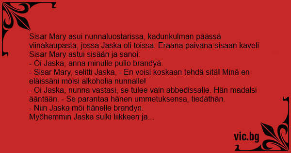 - Sisar Mary, selitti Jaska, - En voisi koskaan tehdä sitä! Minä en eläissäni möisi alkoholia nunnalle!