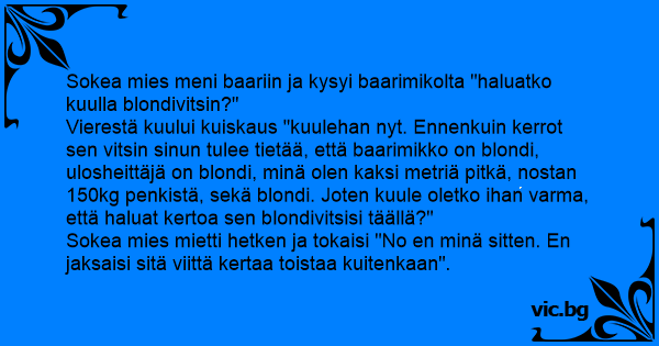 Vierestä kuului kuiskaus "kuulehan nyt. Ennenkuin kerrot sen vitsin sinun tulee tietää, että baarimikko on blondi, ulosheittäjä on blondi, minä olen kaksi metriä pitkä, nostan 150kg penkistä, sekä blondi. Joten kuule oletko ihan varma, että haluat kertoa sen blondivitsisi täällä?"