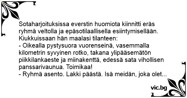 - Oikealla pystysuora vuorenseinä, vasemmalla kilometrin syvyinen rotko, takana ylipääsemätön piikkilankaeste ja miinakenttä, edessä sata vihollisen panssarivaunua. Toimikaa!