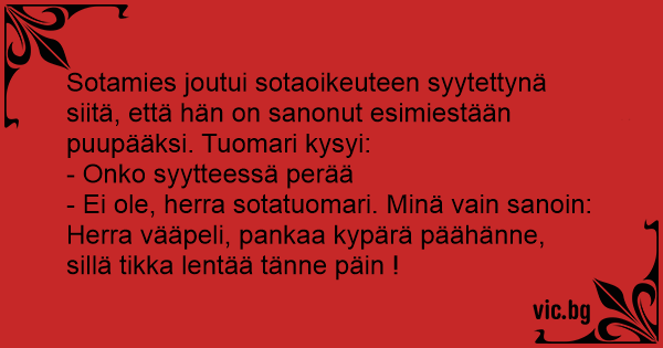 - Ei ole, herra sotatuomari. Minä vain sanoin: Herra vääpeli, pankaa kypärä päähänne, sillä tikka lentää tänne päin !