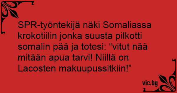 SPR-työntekijä näki Somaliassa krokotiilin jonka suusta pilkotti somalin pää ja totesi: “vitut nää mitään apua tarvi! Niillä on Lacosten makuupussitkiin!”