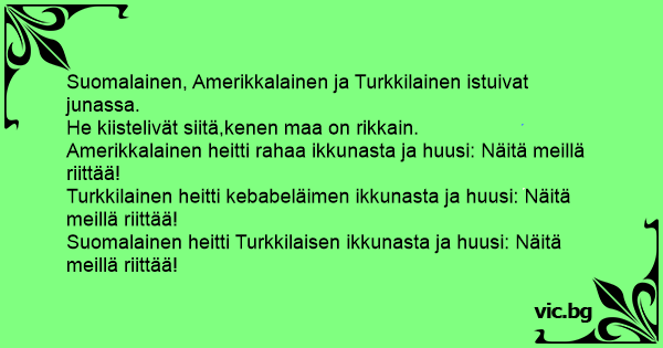 Suomalainen, arabialainen, somali ja amerikkalainen istuivat junassa. Amerikkalainen heitti ison rahatukun ikkunasta, koska halusi erottua joukosta ja rehvasteli: “Minulla on rahaa niin paljon,...