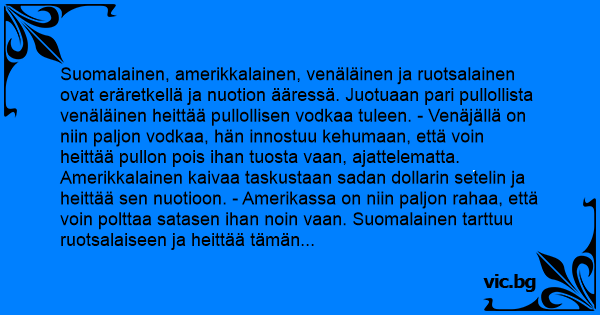 Suomalainen, amerikkalainen, venäläinen ja ruotsalainen ovat eräretkellä ja nuotion ääressä. Juotuaan pari pullollista venäläinen heittää pullollisen vodkaa tuleen. - Venäjällä on niin paljon vodkaa, hän innostuu kehumaan, että voin heittää pullon pois ihan tuosta vaan, ajattelematta. Amerikkalainen kaivaa taskustaan sadan dollarin setelin ja heittää sen nuotioon. - Amerikassa on niin paljon rahaa, että voin polttaa satasen ihan noin vaan. Suomalainen tarttuu ruotsalaiseen ja heittää tämän nuotioon.