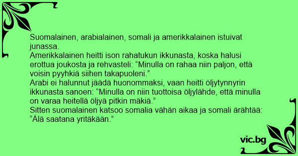 Suomalainen, Amerikkalainen ja Turkkilainen istuivat junassa. He kiistelivät siitä,kenen maa on rikkain. Amerikkalainen heitti rahaa ikkunasta ja huusi: Näitä meillä riittää! Turkkilainen heitti...