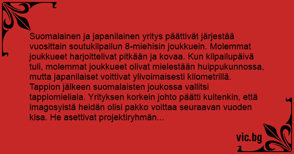 Suomalainen ja japanilainen yritys päättivät järjestää vuosittain soutukilpailun 8-miehisin joukkuein. Molemmat joukkueet harjoittelivat pitkään ja kovaa. Kun kilpailupäivä tuli, molemmat joukkueet olivat mielestään huippukunnossa, mutta japanilaiset voittivat ylivoimaisesti kilometrillä.