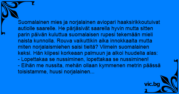 - Eihän me nussita, mehän ollaan kymmenen metrin päässä toisistamme, huusi norjalainen takaisin. Mutta suomalainen siihen:
