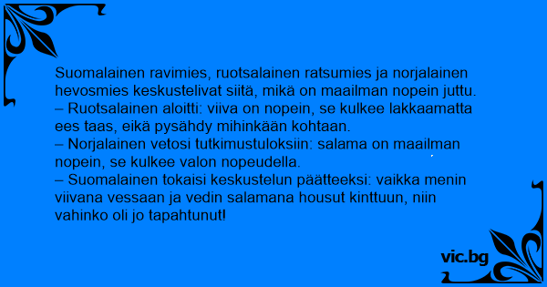 Suomalainen ravimies, ruotsalainen ratsumies ja norjalainen hevosmies keskustelivat siitä, mikä on maailman nopein juttu.