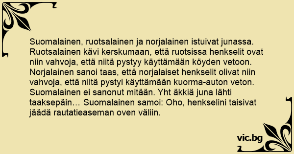 Suomalainen, ruotsalainen ja norjalainen istuivat junassa. Ruotsalainen kävi kerskumaan, että ruotsissa henkselit ovat niin vahvoja, että niitä pystyy käyttämään köyden vetoon. Norjalainen sanoi taas, että norjalaiset henkselit olivat niin vahvoja, että niitä pystyi käyttämään kuorma-auton veton. Suomalainen ei sanonut mitään. Yht äkkiä juna lähti taaksepäin… Suomalainen samoi: Oho, henkselini taisivat jäädä rautatieaseman oven väliin.