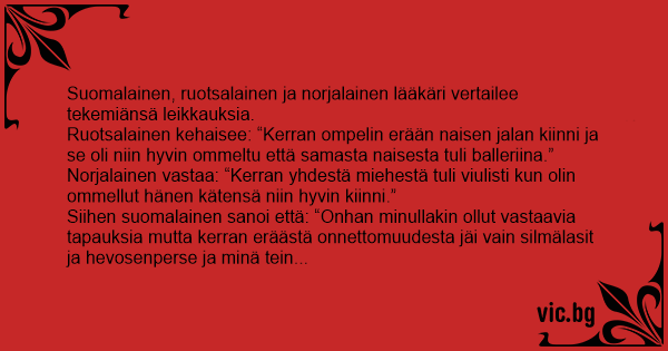 Ruotsalainen kehaisee: “Kerran ompelin erään naisen jalan kiinni ja se oli niin hyvin ommeltu että samasta naisesta tuli balleriina.”