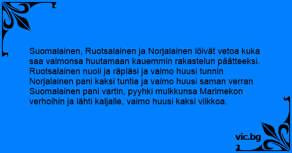 Suomalainen, Ruotsalainen ja Norjalainen löivät vetoa kuka saa vaimonsa huutamaan kauemmin rakastelun päätteeksi.
