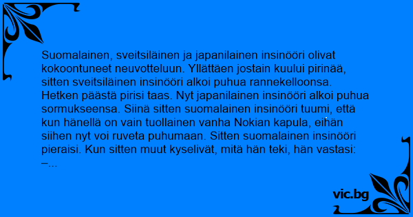 Japanilainen, saksalainen ja suomalainen olivat lounaalla ravintolassa. Japanilaisen kello alkoi soida, ja hän vastasi kellopuhelimeensa. Suomalainen tuumasi, että onpas tekniikka kehittynyt...