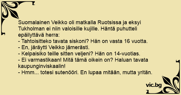 Suomalainen Veikko oli matkalla Ruotsissa ja eksyi Tukholman ei niin valoisille kujille. Häntä puhutteli epäilyttävä herra: