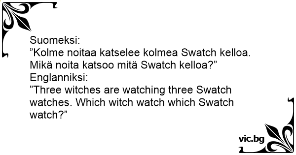 ”Kolme noitaa katselee kolmea Swatch kelloa. Mikä noita katsoo mitä Swatch kelloa?”