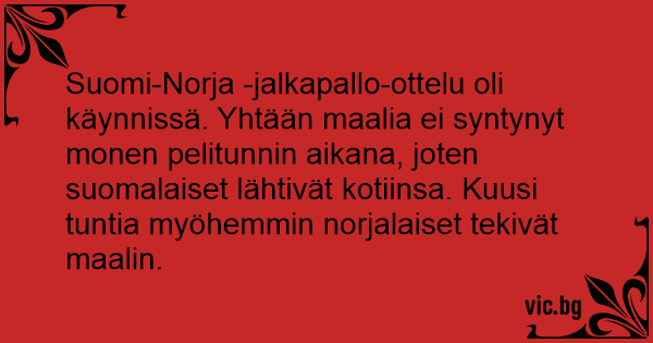 Suomi-Norja -jalkapallo-ottelu oli käynnissä. Yhtään maalia ei syntynyt monen pelitunnin aikana, joten suomalaiset lähtivät kotiinsa. Kuusi tuntia myöhemmin norjalaiset tekivät maalin.