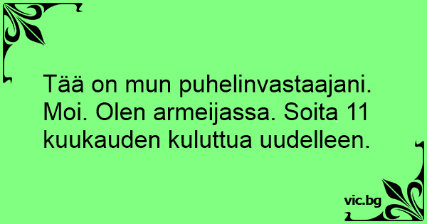 Tää on mun puhelinvastaajani. Moi. Olen armeijassa. Soita 11 kuukauden kuluttua uudelleen.