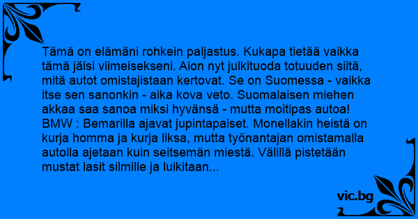 Tämä on elämäni rohkein paljastus. Kukapa tietää vaikka tämä jäisi viimeisekseni. Aion nyt julkituoda totuuden siitä, mitä autot omistajistaan kertovat. Se on Suomessa - vaikka itse sen sanonkin - aika kova veto. Suomalaisen miehen akkaa saa sanoa miksi hyvänsä - mutta moitipas autoa!