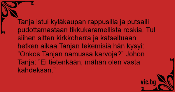 Tanja istui kyläkaupan rappusilla ja putsaili pudottamastaan tikkukaramellista roskia. Tuli siihen sitten kirkkoherra ja katseltuaan hetken aikaa Tanjan tekemisiä hän kysyi: ”Onkos Tanjan namussa karvoja?” Johon Tanja: ”Ei tietenkään, mähän olen vasta kahdeksan.”