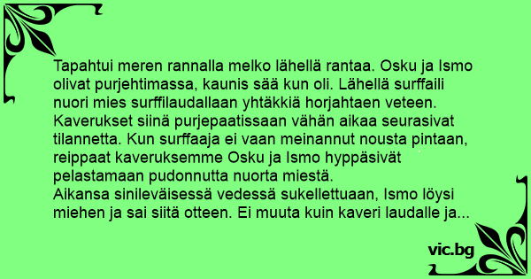 Tapahtui meren rannalla melko lähellä rantaa. Osku ja Ismo olivat purjehtimassa, kaunis sää kun oli. Lähellä surffaili nuori mies surffilaudallaan yhtäkkiä horjahtaen veteen. Kaverukset siinä purjepaatissaan vähän aikaa seurasivat tilannetta. Kun surffaaja ei vaan meinannut nousta pintaan, reippaat kaveruksemme Osku ja Ismo hyppäsivät pelastamaan pudonnutta nuorta miestä.