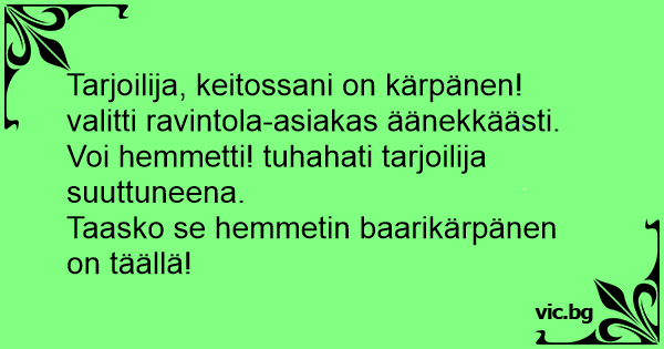 Tarjoilija, keitossani on kärpänen! valitti ravintola-asiakas äänekkäästi.