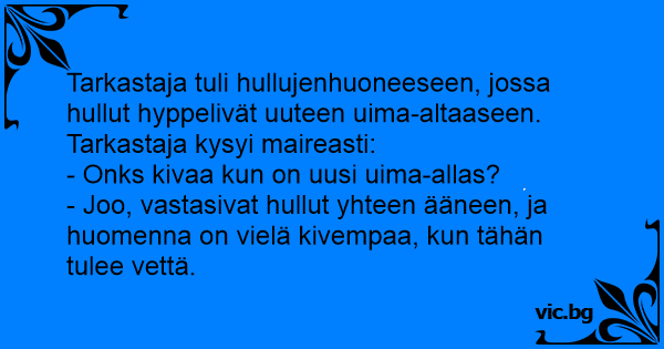 Tarkastaja tuli hullujenhuoneeseen, jossa hullut hyppelivät uuteen uima-altaaseen. Tarkastaja kysyi maireasti:<br />- Onks kivaa kun on uusi uima-allas?<br />- Joo, vastasivat hullut yhteen ääneen, ja huomenna on vielä kivempaa, kun tähän tulee vettä.