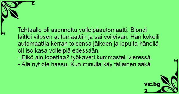 Tehtaalle oli asennettu voileipäautomaatti. Blondi laittoi vitosen automaattiin ja sai voileivän. Hän kokeili automaattia kerran toisensa jälkeen ja lopulta hänellä oli iso kasa voileipiä edessään.