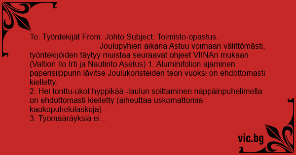 - ------------------------ Joulupyhien aikana Astuu voimaan välittömästi, työntekijöiden täytyy muistaa seuraavat ohjeet VIINAn mukaan (Valtion Ilo Irti ja Nautinto Asetus) 1. Aluminifolion ajaminen paperisilppurin lävitse Joulukoristeiden teon vuoksi on ehdottomasti kielletty.