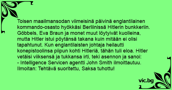 - Intelligence Servicen agentti John Smith ilmoittautuu. Ilmoitan: Tehtävä suoritettu, Saksa tuhottu!