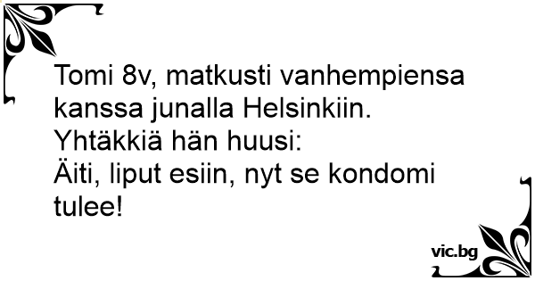 Tomi 8v, matkusti vanhempiensa kanssa junalla Helsinkiin. Yhtäkkiä hän huusi: Äiti, liput esiin, nyt se kondomi tulee!