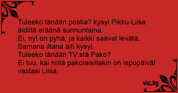 Tuleeko tänään postia? kysyi Pikku-Liisa äidiltä eräänä sunnuntaina.