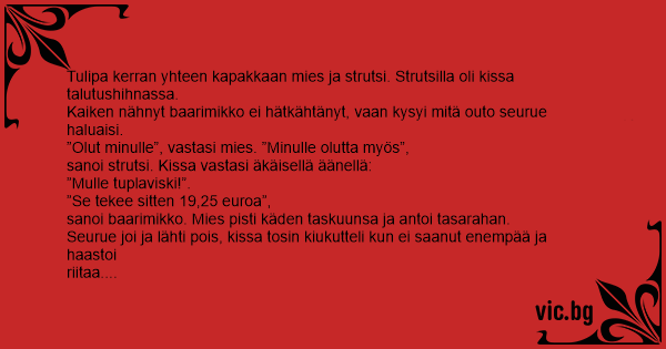 Tulipa kerran yhteen kapakkaan mies ja strutsi. Strutsilla oli kissa talutushihnassa.