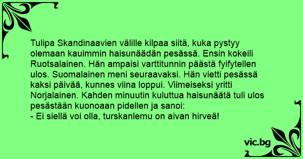 Tulipa Skandinaavien välille kilpaa siitä, kuka pystyy olemaan kauimmin haisunäädän pesässä. Ensin kokeili Ruotsalainen. Hän ampaisi varttitunnin päästä fyifytellen ulos. Suomalainen meni seuraavaksi. Hän vietti pesässä kaksi päivää, kunnes viina loppui. Viimeiseksi yritti Norjalainen. Kahden minuutin kuluttua haisunäätä tuli ulos pesästään kuonoaan pidellen ja sanoi: