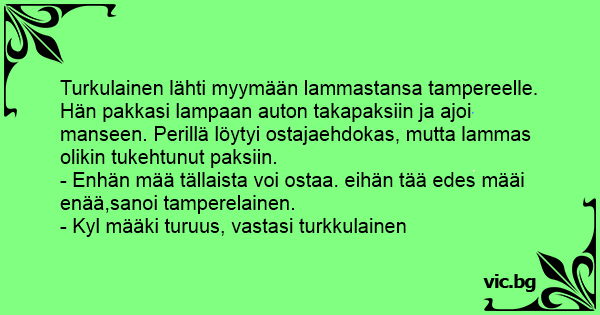 Turkulainen lähti myymään lammastansa tampereelle. Hän pakkasi lampaan auton takapaksiin ja ajoi manseen. Perillä löytyi ostajaehdokas, mutta lammas olikin tukehtunut paksiin.