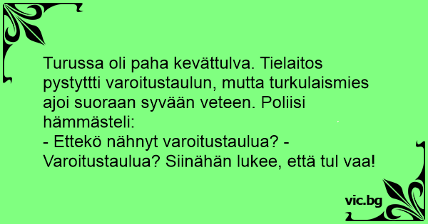 Turussa oli paha kevättulva. Tielaitos pystyttti varoitustaulun, mutta turkulaismies ajoi suoraan syvään veteen. Poliisi hämmästeli: