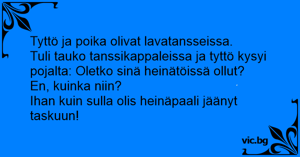 Tuli tauko tanssikappaleissa ja tyttö kysyi pojalta: Oletko sinä heinätöissä ollut?