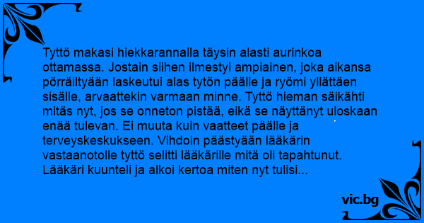 Tyttö makasi hiekkarannalla täysin alasti aurinkoa ottamassa. Jostain siihen ilmestyi ampiainen, joka aikansa pörräiltyään laskeutui alas tytön päälle ja ryömi yllättäen sisälle, arvaattekin varmaan minne. Tyttö hieman säikähti mitäs nyt, jos se onneton pistää, eikä se näyttänyt uloskaan enää tulevan. Ei muuta kuin vaatteet päälle ja terveyskeskukseen. Vihdoin päästyään lääkärin vastaanotolle tyttö selitti lääkärille mitä oli tapahtunut. Lääkäri kuunteli ja alkoi kertoa miten nyt tulisi toimia.
