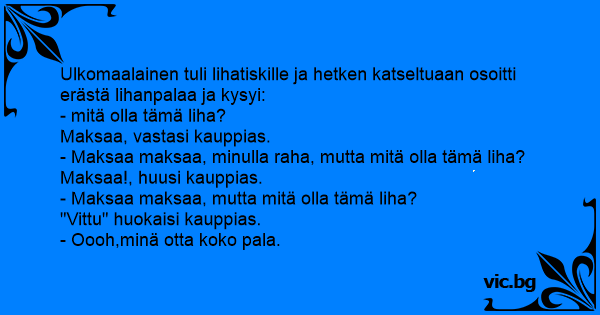 Ulkomaalainen tuli lihatiskille ja hetken katseltuaan osoitti erästä lihanpalaa ja kysyi: