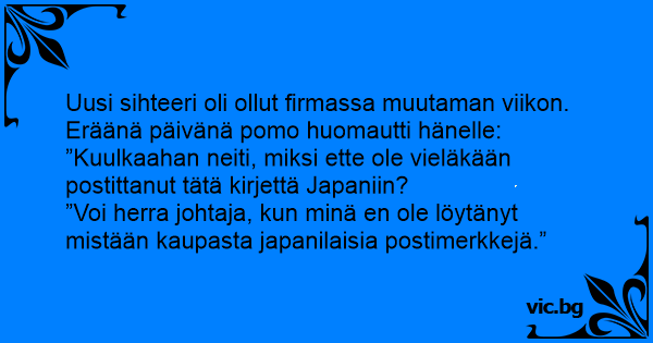 ”Voi herra johtaja, kun minä en ole löytänyt mistään kaupasta japanilaisia postimerkkejä.”