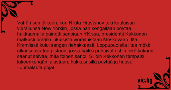 Vähän sen jälkeen, kun Nikita Hrustshev teki kuuluisan vierailunsa New Yorkiin, jossa hän kengällään pöytää hakkaamalla painotti sanojaan YK:ssa, presidentti Kekkonen matkusti eräälle lukuisista vierailuistaan Moskovaan. Ilta Kremlissä kului sangen riehakkaasti. Loppupuolella iltaa mökä alkoi saavuttaa pisteen, jossa kaikki puhuivat ristiin eikä kukaan saanut selvää, mitä toinen sanoi. Silloin Kekkonen tempaisi lakeerikengän jalastaan, hakkasi sillä pöytää ja huusi: